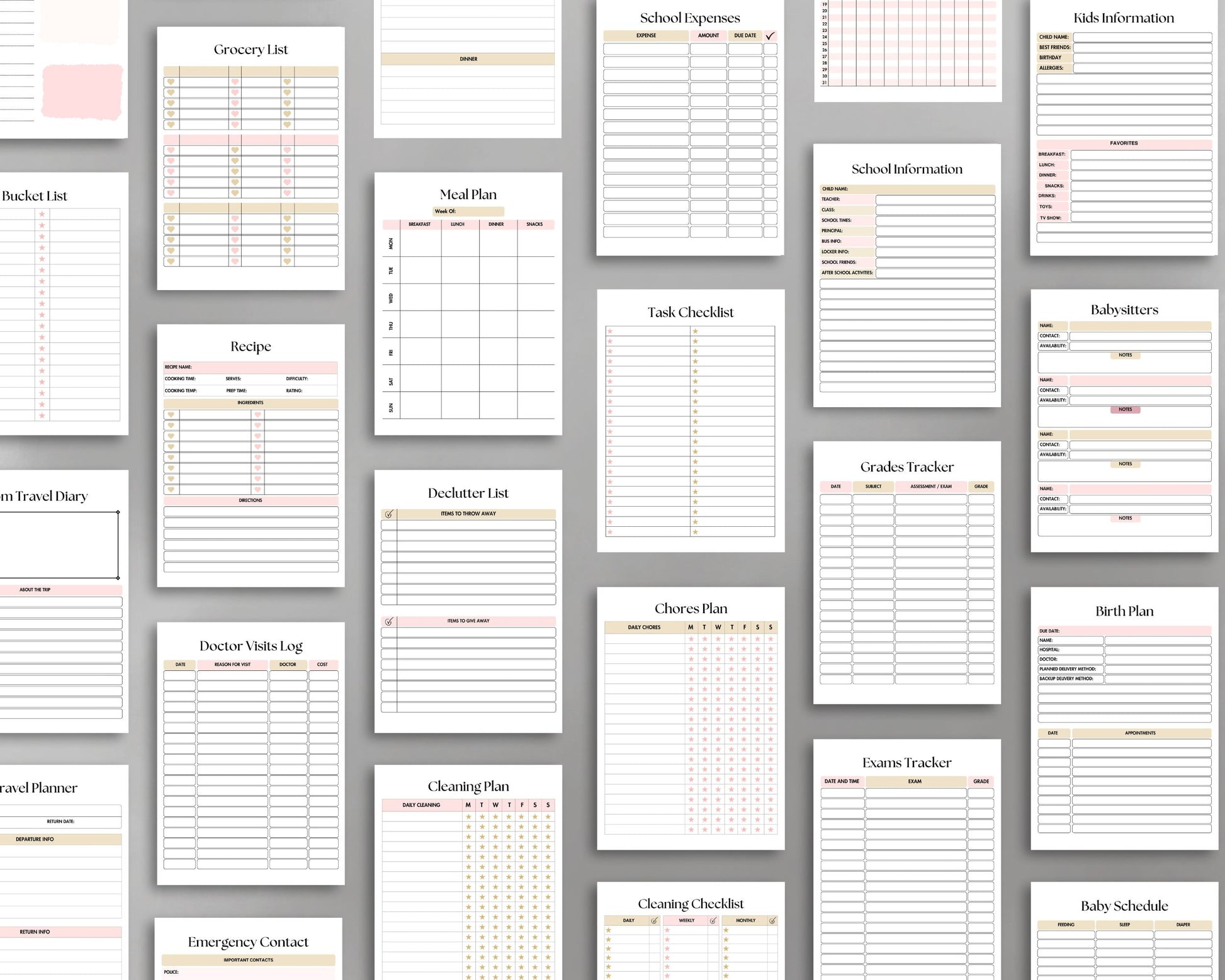- Comprehensive family organization worksheets, kids’ activity trackers & household planning tools